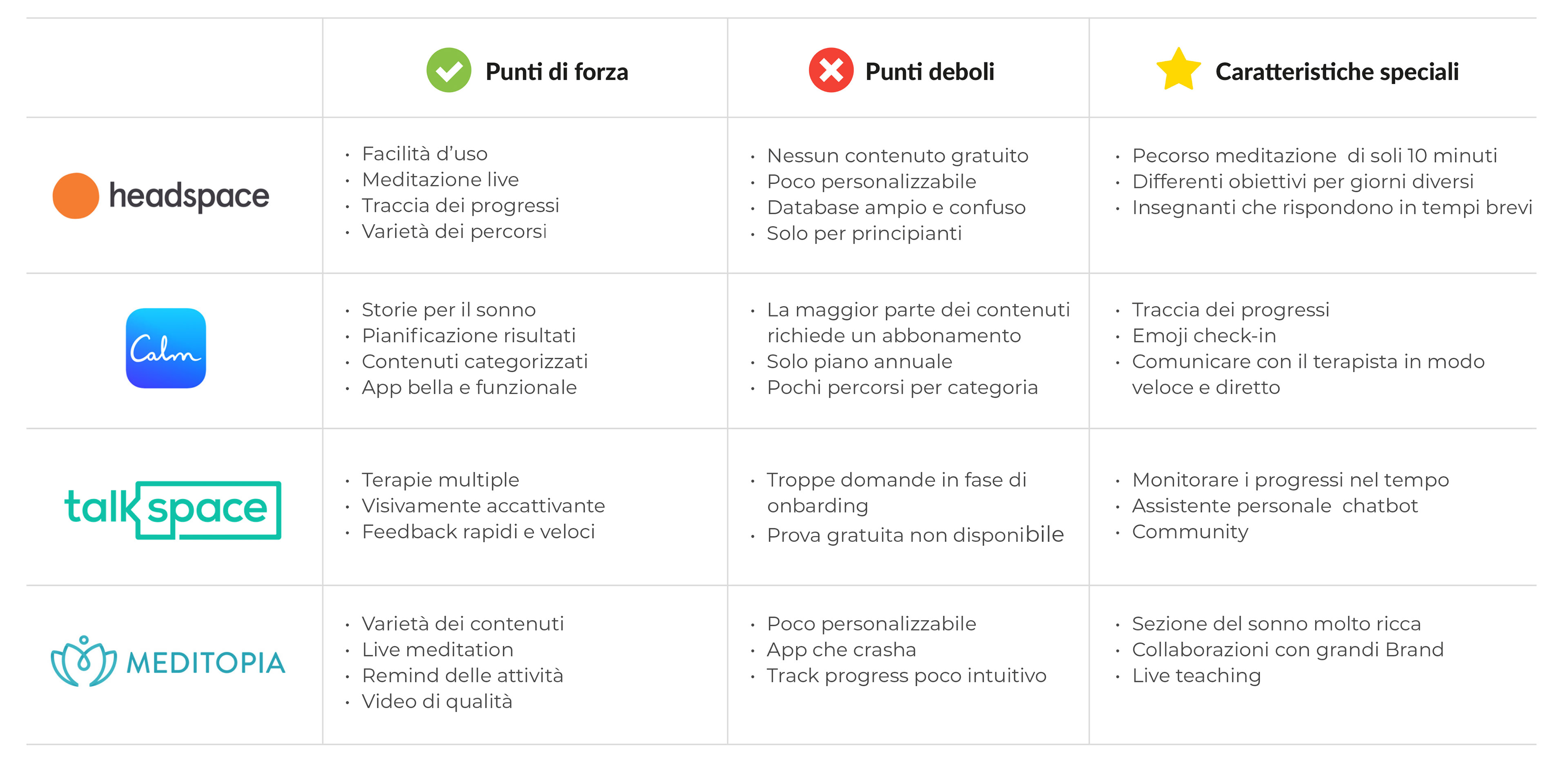Di seguito un riassunto della competitor analysis suddiviso per prodotto.